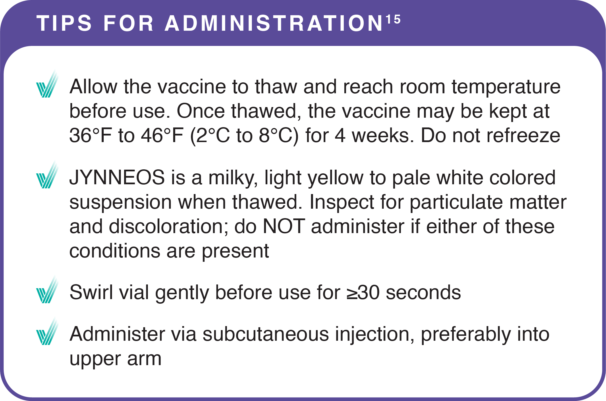 Approved route of administration for JYNNEOS is subcutaneous. Emergency Use Authorization for intradermal administration was issued by FDA on August 9, 2022.1